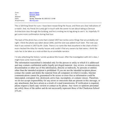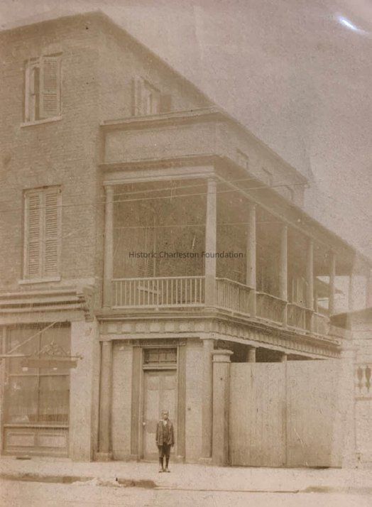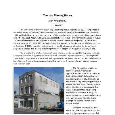 Constructed ca. 1814-1825. The three-story brick house at originally occupied a 65' by 231' King Street lot formed by joining sections of a large parcel that had belonged to planter Stephen Lee. Mr. Lee died in 1808, and his holdings at the southeast corner of King and Spring Streets were platted into large lots and sold off. First, Jacob Alison and Regina Alison sold Lot 3 (65' by 181') on King Street for $1500 in August 1810 to Mordecai Cohen who flipped it in January 1811 to Thomas Fleming for $1770. Next, Mr. Fleming bought Lot 5 (50' by 226') on Spring Street that abutted Lot 3 at the rear for $600 at an auction of December 1, 1813, from the estate of Mr. Lee. Mr. Fleming pared off part of the Spring Street property and added it to the rear of the King Street lot to deepen the King Street property to 231'. (Eberle, 2020.)