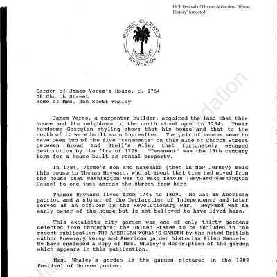 Constructed ca. 1754. James Veree, a French Huguenot carpenter, purchased a parcel containing the lots where 56, 58, and 60 Church Street stand in 1754 and probably constructed the house at 58 Church immediately and the dwelling to the north a decade later. The property at 58 Church is the largest of the original houses but contains simple woodwork. James Veree Jr. sold the house to a signer of the Declaration of Independence, Thomas Heyward, who apparently used it as a rental property. A single house with 3 front bays, it has been noted for many years for its rear garden, designed in the early 1940s by Mrs. Benjamin (Emily) Whaley with landscape architect Loutrel Briggs. Visitors from around the world still come to visit the garden made famous