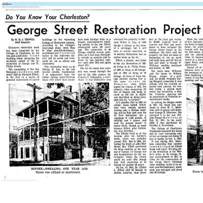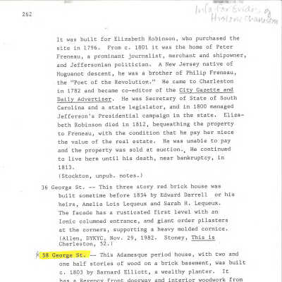 File contains house histories from Architectural Guide to Charleston, Information for Guides of Historic Charleston, City of Charleston Tour Guide Training Manual, Gems in a Crown: A Pictorial of Preservation at the College of Charleston, and Our Charleston: Lowcountry Photos, People and Places; 1886 Earthquake damage assessment; Hurricane Hugo damage assessment; newspaper article (DYKYC, 1971); newspaper article about 26 George (DYKYC, 1977).Collection