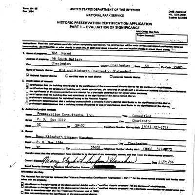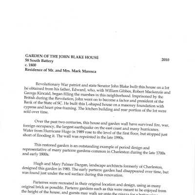 Three files contain documentation of the easement on the property including related correspondence and Confirmation of Understanding; correspondence related to the sale of the property; Part I certification (National Register); easement appraisal; annual inspection reports, requests for alterations, and correspondence related to the management of the property; architectural drawings submitted in support of Request for Alternations; FOHG house history (undated/1980s?); FOHG garden histories (1994, 1999, 2010); newspaper articles (including 1983) DYKYC); article from Landscape Architecture (undated); house history from Information for Guides of Historic Charleston (1984); house history from Vernacular Architecture of Charleston and the Lowcountry; historical/chain-of-title research notes; photocopy of 1984 plat; Historic Structures Report (Preservation Consultants, 2000).