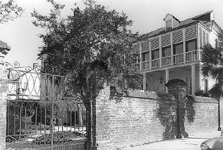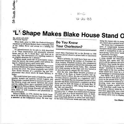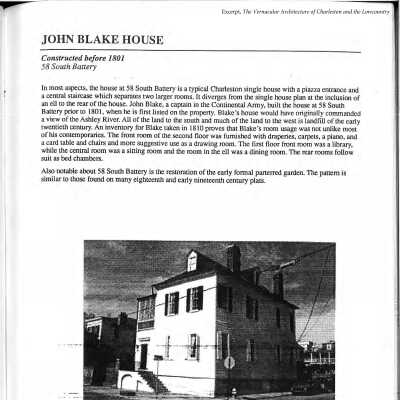 Constructed ca. 1800; restored 1985. Built by John Blake, an early president of the Bank of South Carolina, this L-shaped structure exemplifies the endurance of early Charleston construction. Many surrounding buildings of the period succumbed to the natural disasters that plagued Charleston during the 19th century; yet this building, constructed on a masonry foundation with cypress and heart pine framing, survived. The structure possesses a wealth of late-Georgian and Federal details on both the exterior and interior, especially in its modillioned cornice. Its old parterre, visible through early-19th century wrought-iron gates, was restored by the present owner. (Poston, Buildings of Charleston.)