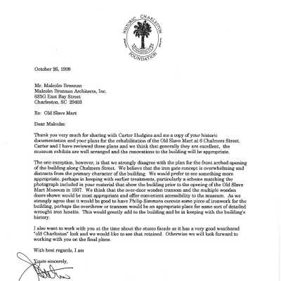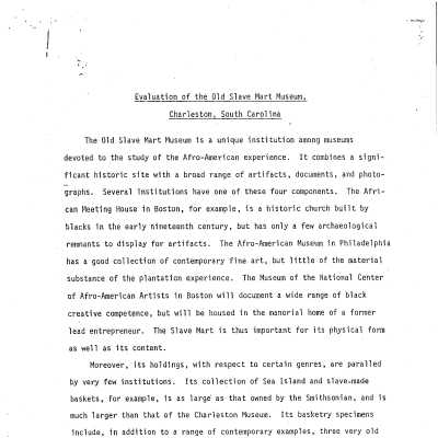 File contains excerpt from Vernacular Architecture of Charleston; research report (Pat Sullivan, 2008); research report "Defining the Barracoon of Ryan's Slave Mart" (Kristina Poston, 2017); "Summary of Historical Documentation Supporting Architectural Concept for the Old Slave Mart" (Malcolm Brennan (1998) (includes article "The Old Slave Mart Museum: Rediscovery the Past" by Edmund Drago and Ralph Melnick); newspaper articles; National Register of Historic Places Nomination Form; advertisement for a sale of slaves (1852); report "Evaluation of the Old Slave Mart Museum" relating to its potential as a museum (unattributed, undated); correspondence (1999) in opposition to the redevelopment of 6 Chalmers as a museum; BAR application (2000) to restore the front facade to its 1800s appearance (no indication of approval status).