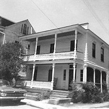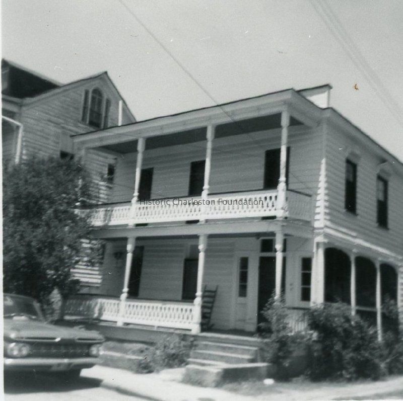 B&W photograph of 6 George Street, corner view, south and west (piazzas) elevations. Car parked on the street in front of the house. Demolished for the creation of Menotti Street.
