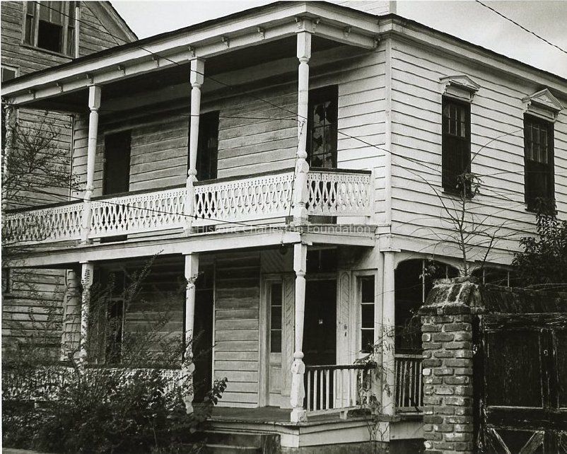 B&W photograph of 6 George Street, corner view, south and west (piazzas) elevations. Demolished for the creation of Menotti Street.Collection