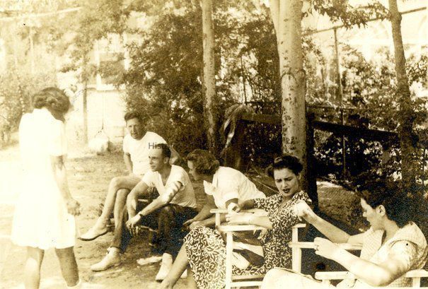 b: Four women and two men gathered in the garden, chatting.Collection