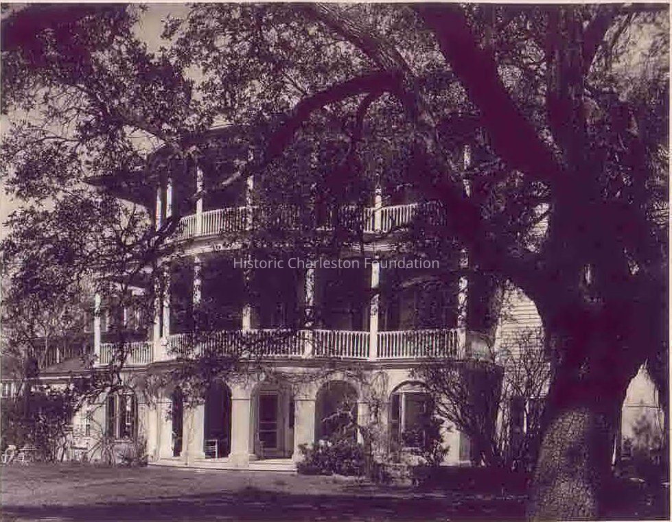 B&W photograph of the Parker-Drayton House (6 Gibbes Street), south elevation, featuring the bowed front piazzas. View partially obscured by the oak tree in the left foreground.Collection