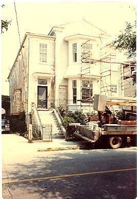 Three color photographs of 6 New Street, street (front) elevation, during repair work. Scaffolding surrounds the house. 8 New Street is seen in one of the photos.Collection