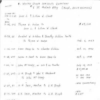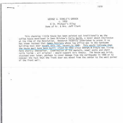 Three files contain documentation of the easement on the property; appraisal (2019); property research report including narrative, chain-of-title, timeline, maps, etc. (Lavelle, 2018); FOHG garden history with hand-drawn landscape plan (1979); historical/chain-of-title research notes; photocopy of plat (undated); photocopy of 1813 deed and plat (Winstonley to Downie); photocopy of 1799 plat; newspaper article (Susan Pringle Frost, date not indicated); correspondence (2 letters) related plans for the construction of a garden building (2001); 1886 Earthquake damage assessment; Hurricane Hugo damage assessment (PDF only).