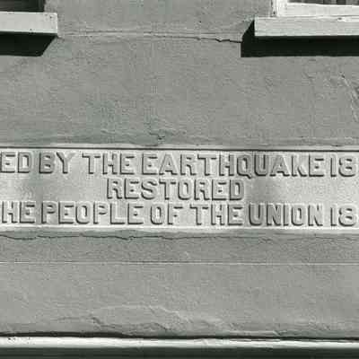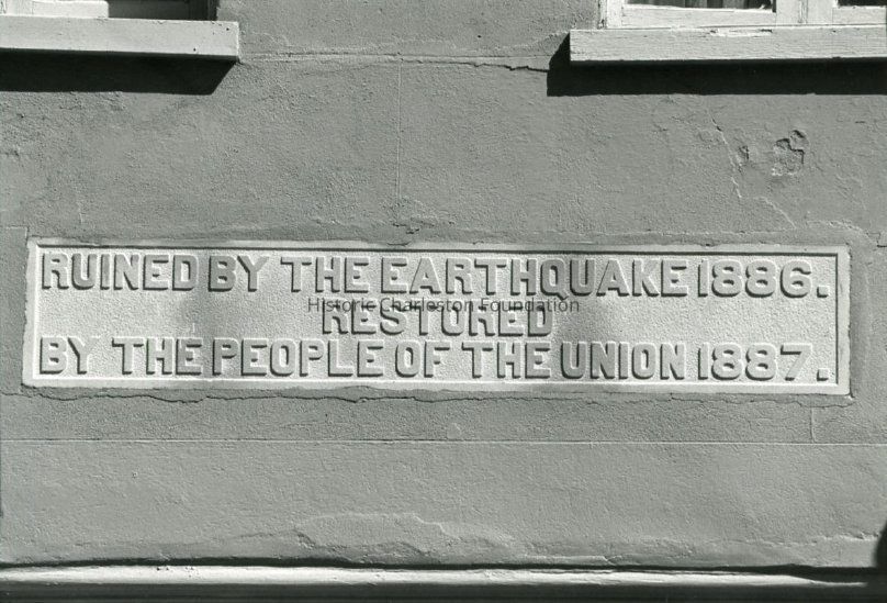 c: Detail of the sign over the center doorway: "Ruined by the Earthquake 1886. Restored by the People of the Union 1887."Collection