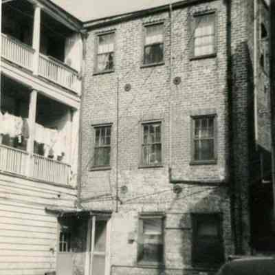 a: Street elevation, before neighborhood rehabilitation. Laundry hanging on piazza. Measures 2.75" x 3".