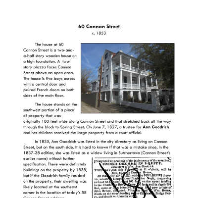 Constructed ca. 1853, 60 Cannon Street is a 2½ story wooden house on a high foundation, with a 2-story piazza facing Cannon Street above an open area.