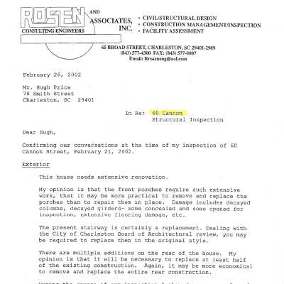 File contains house history (Eberle, 2016); excerpt from The Old Codgers Charleston Address Book; Rosen and Associates (engineers) inspection reports (2002, 2007).