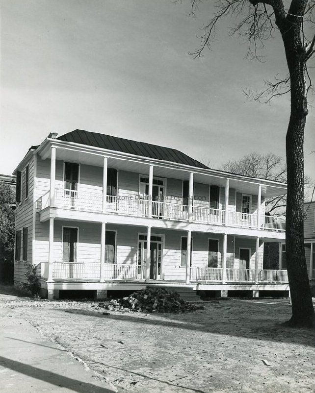 B&W photograph of the west (piazzas) elevation of 61 Laurens Street, taken after rehabilitation, but before landscaping. Pile of bricks in front of house.Collection