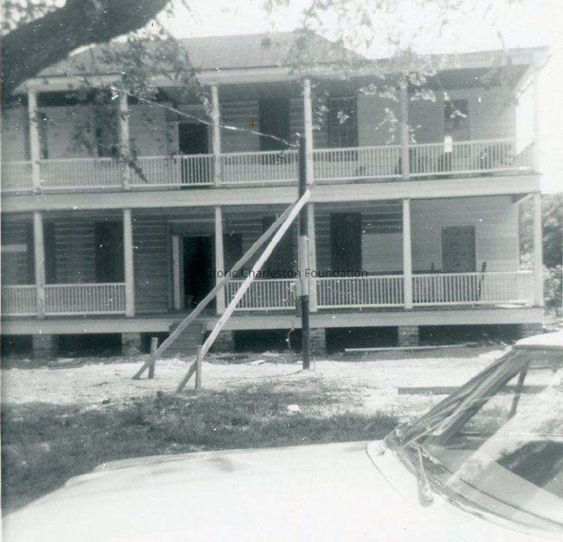 B&W photograph of the west (piazzas) elevation of 61 Laurens Street, taken during rehabilitation.