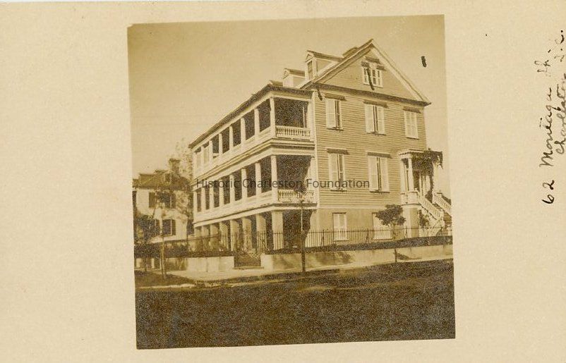 Photographic postcard of 62 Montagu Street (Jonathan Steinmeyer House) taken from across the street showing south (piazzas) and east (front) elevations. Also shows the street corner of Montagu and Gadsden Streets and a portion of the west elevation of 64 Montagu.