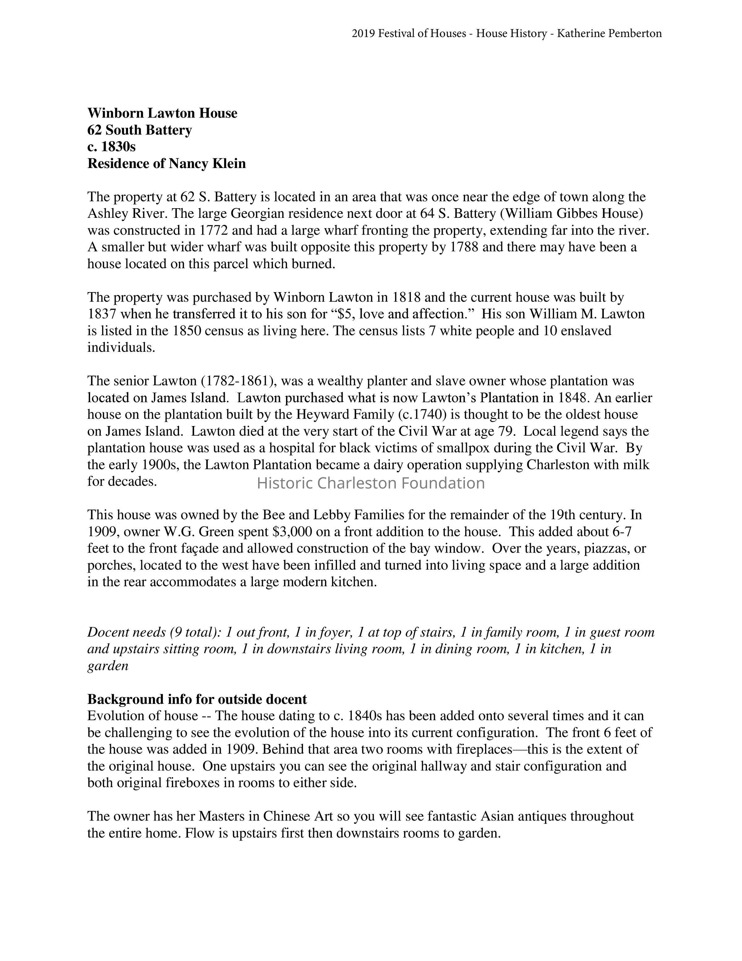 Constructed ca. 1830s. This property is located in an area that was once near the edge of town along the Ashley River. It was purchased by Winborn Lawton in 1818 and the current house was built by 1837 when he transferred it to his son who was living there by 1850. The house has been added onto several times making it challenging to see the evolution of the house into its current configuration. (FOHG house history, 2019.)