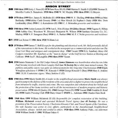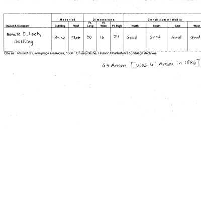Constructed ca. 1839; rehabilitated mid-1960s. One of two small gable-ended, masonry buildings (63 and 65 Anson Street) constructed as dependencies for 48 Society Street. Mrs. Robinson rented these properties separately before the Civil War. 63 Anson Street is listed as having been occupied by enslaved Africans in the 1861 census.