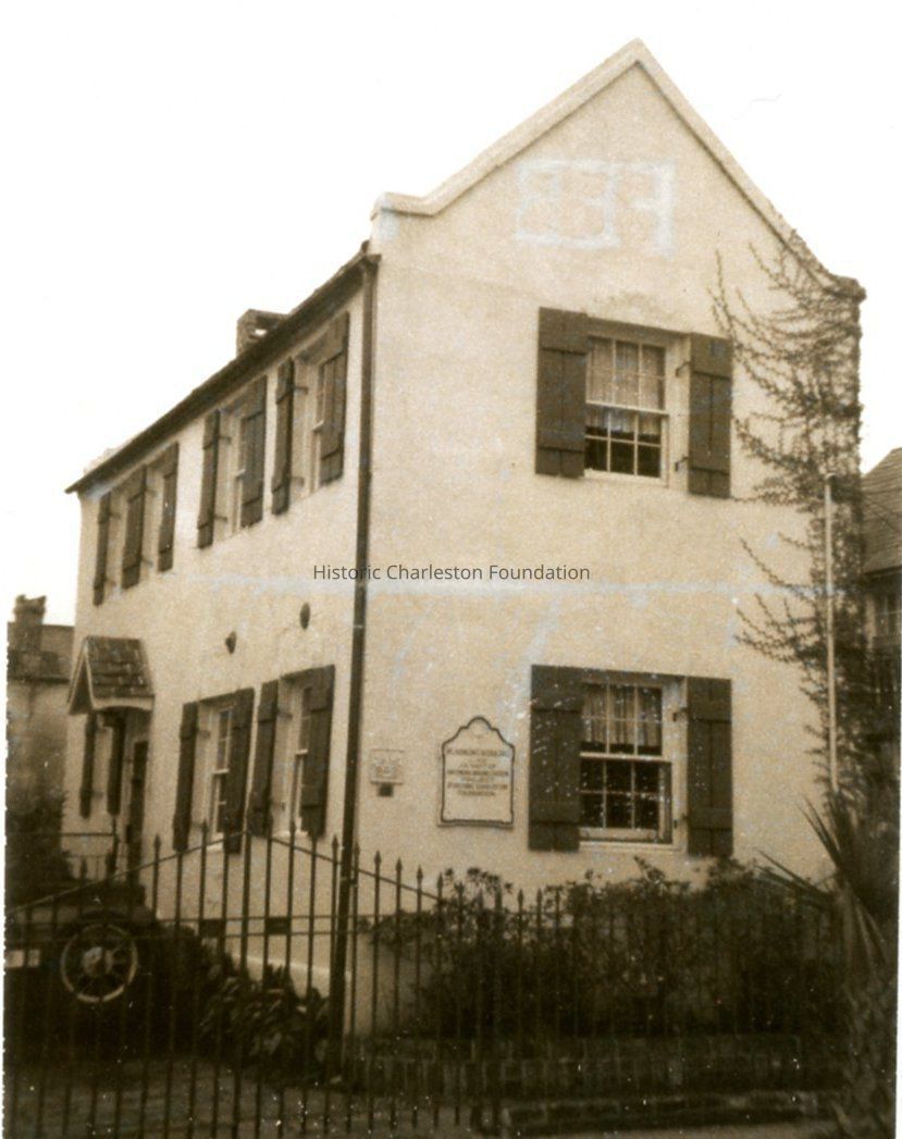B&W Polaroid photograph of 63 Anson Street (Susan Robinson Dependency) after rehabilitation, street (front) elevation, corner view. HCF Ansonborough Rehabilitation Project plaque on wall. Wrought iron gate in front. Photograph dated February 7, 1965.Photograph Details