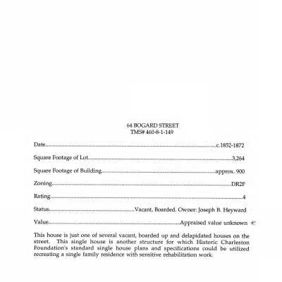 File contains historical/chain-of-title research notes including deeds (1887, 1916) and Ward Book excerpts; HCF property information sheet (date of construction, building and lot size, zoning, rating, status, value, notes); estimated costs of rehabilitation; 20th c. occupancy history from Old Codgers Charleston Address Book (pdf); 1886 Earthquake Damage Assessment (pdf); Hurricane Hugo Damage Survey (pdf).Collection