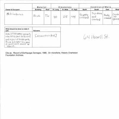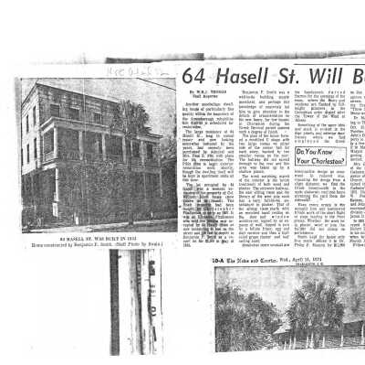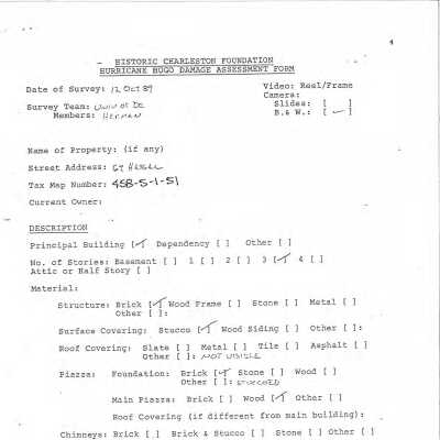 File contains scant historical research notes; newspaper articles (including 1971, 1972 DYKYC); photocopies of photos of exterior and interior (unattributed, undated); 1886 Earthquake damage assessment; Hurricane Hugo damage survey (PDF); correspondence and other documentation, including City Council proceedings from 1977, related to an application for rezoning (1982).Collection