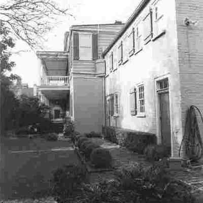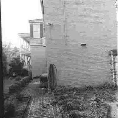 b: View of the rear portion of the south elevation showing the edge of the piazzas, hyphen, and kitchen house. Looking west from the garden.