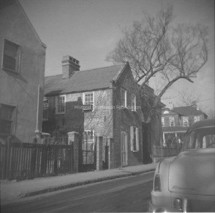 B&W photograph of 65 Anson Street (Susan Robinson Dependency), street elevation, before neighborhood rehabilitation. Partial view of 63 Anson Street at left. "ARP" written on back of photo.Collection