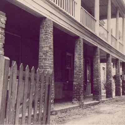 b: South elevation featuring the brick piers on the ground level piazza before rehabilitation. Gate in foreground.Collection