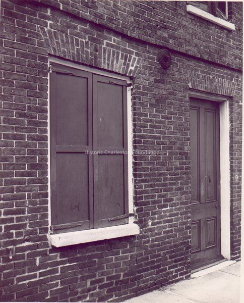 B&W photograph of 66 Anson Street (Chazal House), exterior wall, featuring a door and shuttered window are featured.Collection