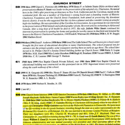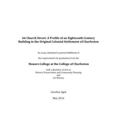 File contains FOHG house history (2013); house history with chain-of-title (Laura Sparks, 1987); newspaper photograph with caption regarding demolition threat (1964); occupancy history (1990-1999) from Old Codgers' Charleston Address Book; 1886 Earthquake damage assessment survey; Hurricane Hugo damage assessment survey and photo (see Media link); Bachelor's degree (historic preservation) essay "66 Church Street: A Profile of an Eighteenth Century Building in the Original Colonial Settlement of Charleston," which includes historical and deed research, maps, photos, and other supporting documentation (Caroline Agid, 2016).Collection