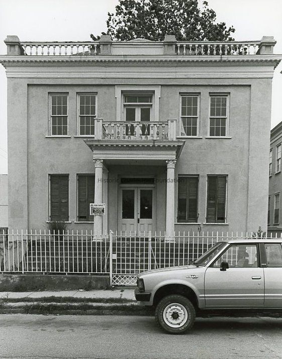 Two B&W photographs of the Lazarus-Gadsden Building (66 Hasell Street), south (front) elevation, taken after exterior renovation (portico and piazza removal). Slightly different orientations. "For sale" sign posted on entry column. Iron gate in foreground.