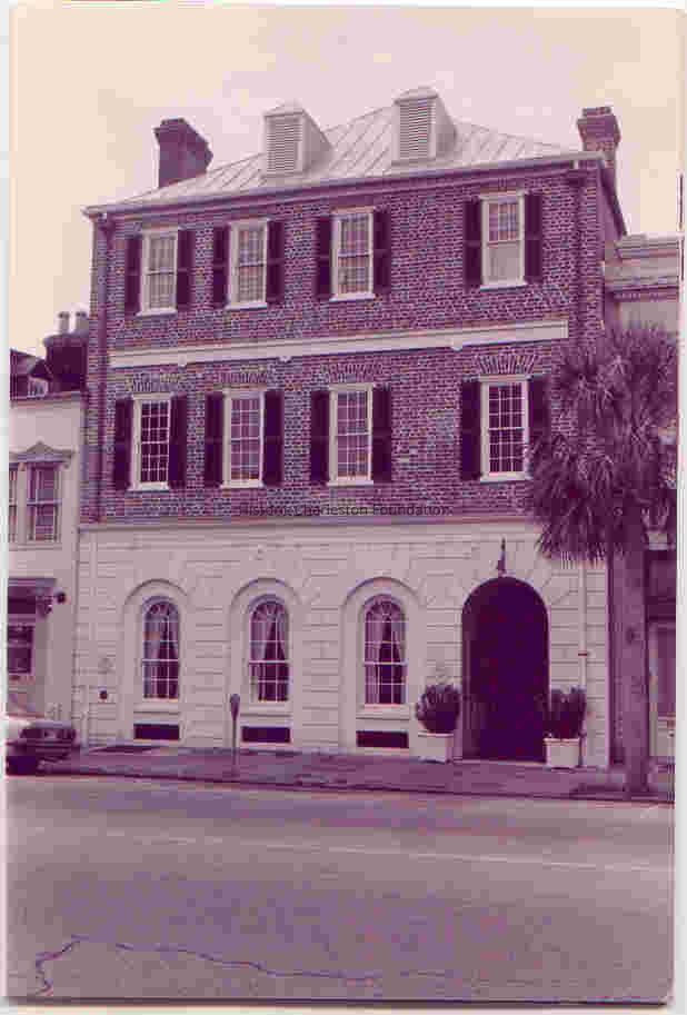 Constructed 1758-65; restored and rehabilitated 1973-74. Constructed by merchant John Hume, the son of a wealthy Goose Creek planter, this three-story brick building with a side-passage originally housed a shop on the first floor and a residence above. A now-demolished outbuilding served as a winter studio for the American painter and inventor Samuel F.B. Morse in 1820. In the 19th century the main building was the annex of the popular Jones or Mansion House Hotel, located next door to the west and since demolished. The ground story with rusticated detailing dates from a 1970s rehabilitation that returned the original side entrance. (Poston, Buildings of Charleston.)