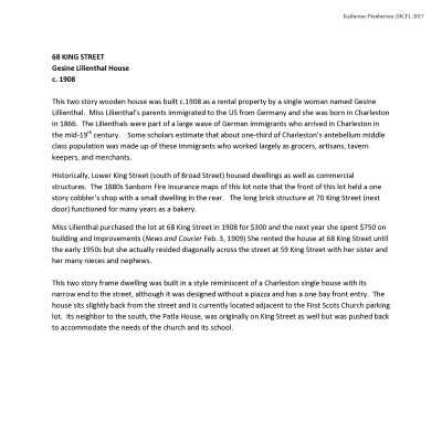 Constructed ca. 1908 as a rental property by Gesine Lilienthal, a single woman. A two-story frame dwelling built in a style reminiscent of a Charleston single house.