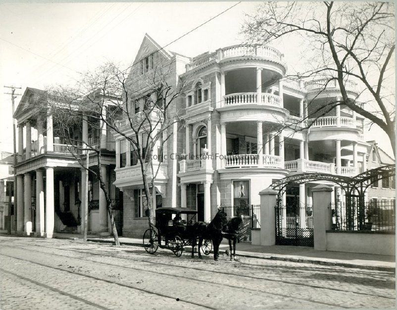 Note included with photo: "Modern adaptation of the "Gallery." Great open-air sitting-rooms screened from the street and connected by narrower galleries. (South Carolina Hall, birthplace of Secession, in the rear to the left.)"Created By