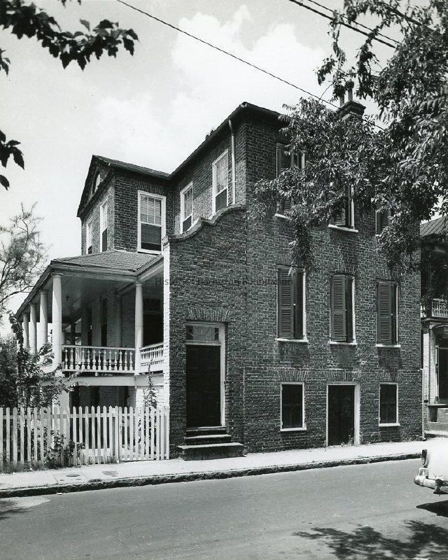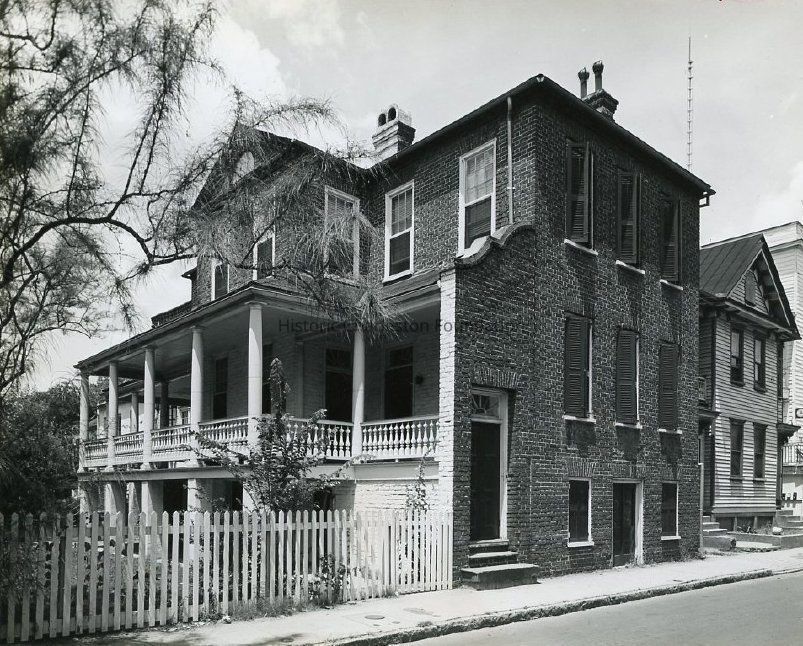 a: Southeast corner of the building showing its piazzas and front facade. White picket fence in foreground. The house at 73 Anson Street, later demolished in view at right.