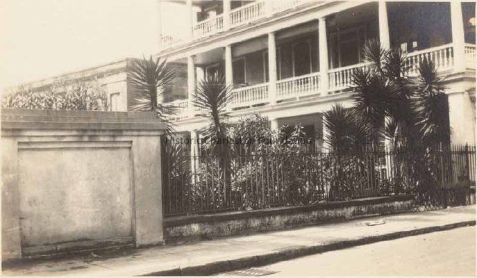 Scan of photograph showing the partial south elevation -- piazzas and iron fence -- of 69 Church Street (Capers-Motte House).Photograph Details
