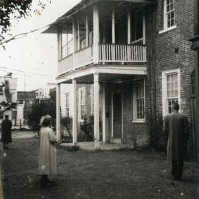 c: View of 6B Courthouse Square. Portion of 6A Courthouse Square at right. Woman (likely Frances Edmunds) and man stand in front looking at the house.