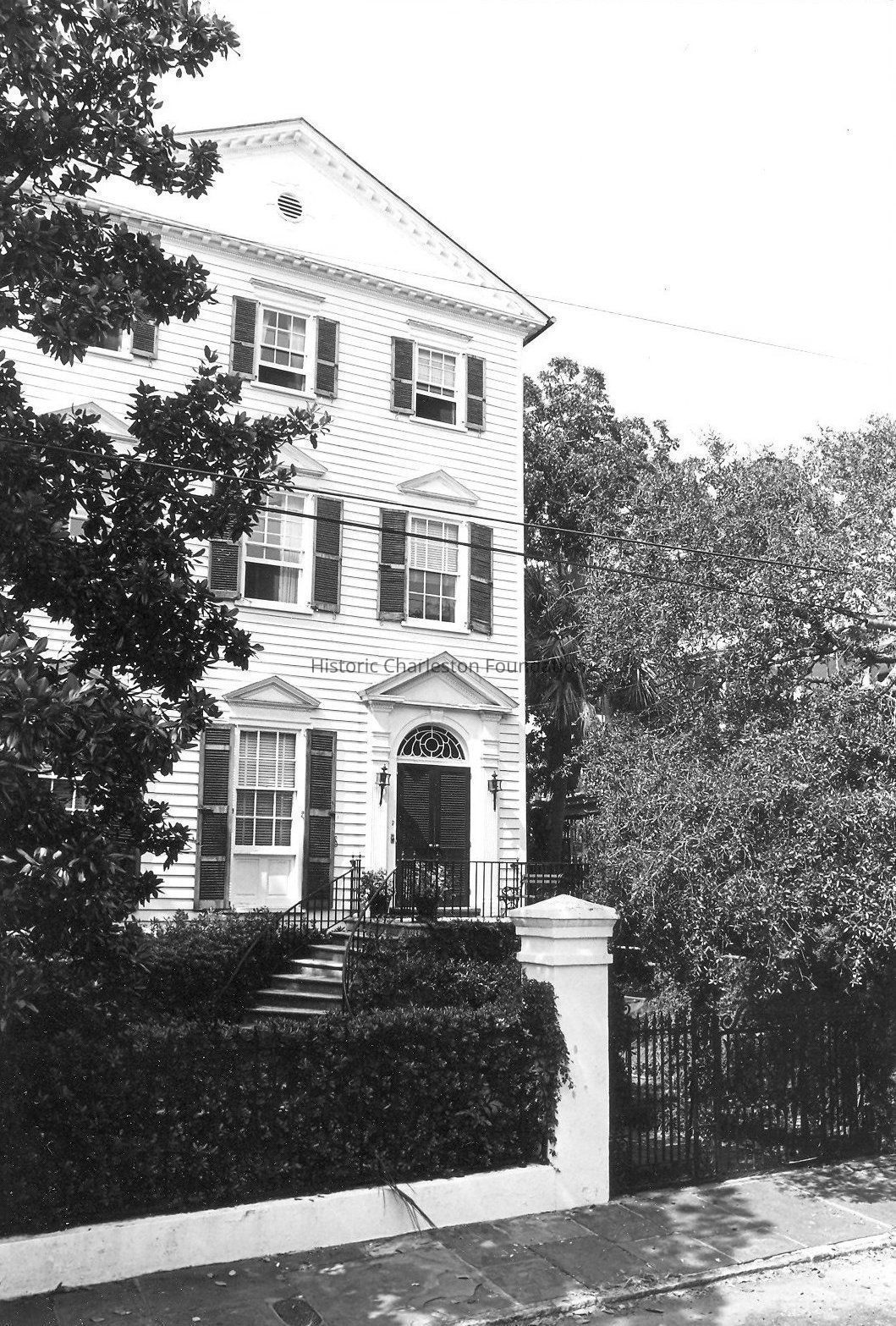Constructed ca. 1887. Built by a descendant of the Charlestonian of the same name, who served as the president of the Continental Congress, the house on this site replaced a substantial masonry building occupied in the antebellum period by Martha Laurens Roper, widow of the builder of 9 East Battery. After the earthquake the building was considered too damaged to be repaired, and Laurens built a new house on the old masonry foundation, using high-grade heart pine lumber. When complete the building stood 2½ stories tall with an unusual closed gambrel or modified mansard roof, with mansard overhangs over both its central dormer and its front door. In the mid-1930s Dr. and Mrs. Joseph I. Waring acquired the house and changed it to a mix of Georgian and Neoclassical styles. Raising the roof by one story to a pedimented gable, he added pedimented window heads over the first- and second-story windows and a Neoclassical fanlight over the front door, in addition to many other changes. Dr. Waring was one of South Carolina's leading historians, particularly expert on its early medical history, writing the book A History of Medicine in South Carolina.