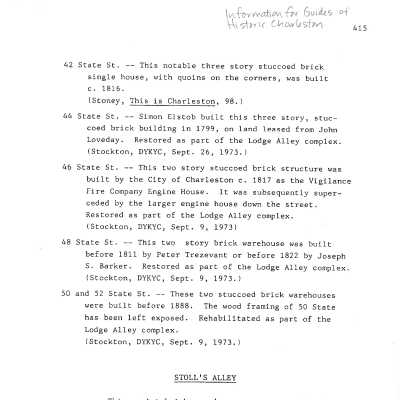 File contains narrative history (by GMH); FOHG house history (1995); house history from Information for Guides of Historic Charleston (1984); first floor plan; brief historical/chain-of-title research notes; photocopy of photograph of Stoll's Alley before ca. 1930 restoration.Collection