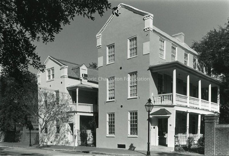 B&W photograph of the Henry Horlbeck Houses (70-72 Coming Street), front elevation of both buildings showing the southwest corner of each and their piazzas.