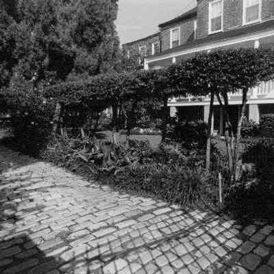 b: View of the piazza. Tree-lined bricked driveway in foreground. Two copies of photo in sleeve.