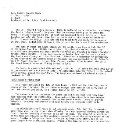 File contains FOHG house history (undated); SC Historical Society house history (undated); extensive house history by Messrs. Barnwell and Bailey and Mr. Henry Staat (undated), including chain-of-title research and plats; house history from Architectural Guide to Charleston (Simons & Thomas); newspaper articles (including 1975 DYKYC); excerpt from Marion's The Charleston Story; National Register Nomination Form; Rosen and Associates inspection report (2001); photograph of a portrait of Robert Brewton (1759).