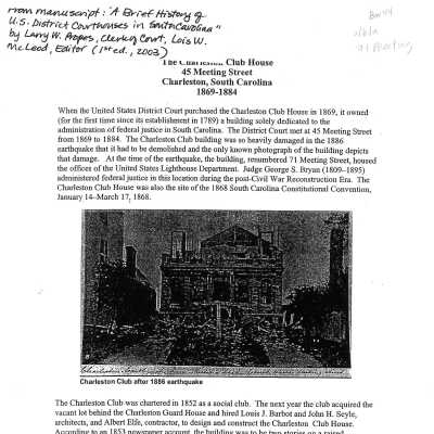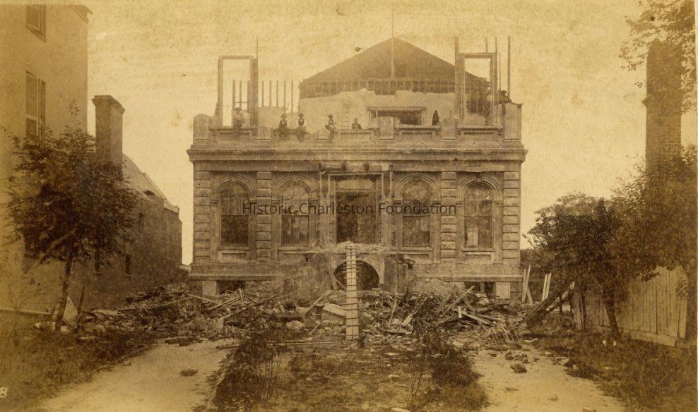 Constructed ca. 1863. Louis J. Barbot and John H. Seyle, architects; Albert Elfe, contractor. Two stories on raised basement with Corinthian columns, slate roof, of brick construction with imitation brownstone stucco covering, and large windows. Served as a social club and the offices of the U.S. Lighthouse Department. Building was heavily damaged in the 1886 Earthquake and was demolished. The Constitutional Convention of South Carolina was held in this building in 1868, out of which came a state constitition that embodied many principles absent from previous constitutions, including abolishing race as a limit on male suffrage. Currently the site of the Hollings Federal Judicial Center.