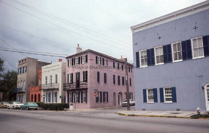 Kodachrome slide featuring a view of 71 to 79-81 East Bay Street, taken from across the street looking southwest. Shows 71 East Bay, 73 East Bay, 75 East Bay, 77 East Bay (a/k/a 1 Tradd), and 79-81 East Bay, east (front) elevations.
