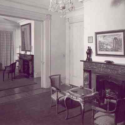 Two B&W photographs of the view from the upstairs drawing room of 72 Anson Street (Kohne-Leslie House) into the adjacent room. Pocket door between the two rooms.