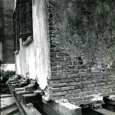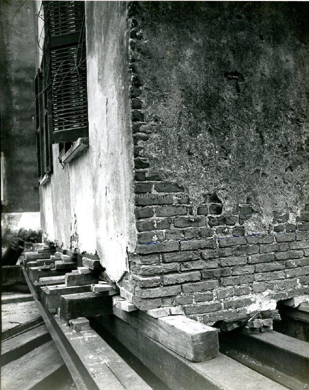 b: Detail of crossbeams underneath the house. Written on back of photo: "Base of 72 George as it is being moved bout to new college street address (Feb. to June of 1972). Please note the last eight courses are laid in a harsh reed 'foundation brick' while those above are in Charleston 'grey." Greys measure: [blank]. Foundation bricks measure: [blank]."