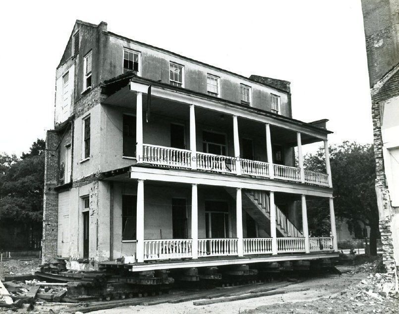 No property file. Constructed ca. 1837; moved and rehabilitated 1972. John King built this impressive 3½-story Greek Revival style Charleston single house at the time of the Civil War. The property was held in trust for Virgil A. Berry, a free person of color. The College of Charleston was responsible for shifting the house a full 90 degrees to make room for the Physicians Memorial Auditorium in 1972. The move was made after the building was braced with steel crossbeams and adjusted every few feet to prevent cracking. 74 George Street, a 3½-story masonry Charleston single house, was shifted some years later to make way for a second phase of the science building. (Poston, Buildings of Charleston.)Collection