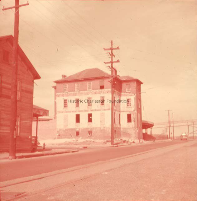 Color photograph of a house under construction, likely 729 East Bay Street. Grace Memorial Bridge is visible in the background. Also in view is the dwelling at the southwest corner of East Bay and Blake Streets, possibly 1 Blake Street.Photograph Details
