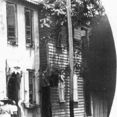 Photographic reprint of an early 20th century B&W photograph of 74 Church Street (Russell-Dehon Tenement) (right) and 76-78 Church Street (left), street (front) elevation. Woman walking with a child on sidewalk. Child stands in the doorway of 76 -78 Church Street.Collection