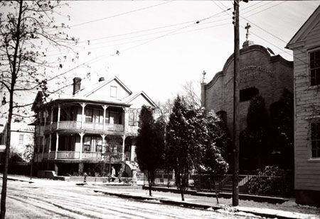 B&W photograph (scan) showing the corner of St. Philip Street and Fishburne Streets, at what is today 74 Fishburne Street and the Advent Church of Charleston (272 St. Philip Street).Context