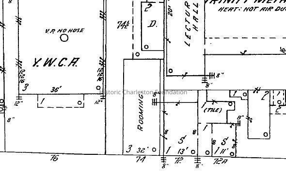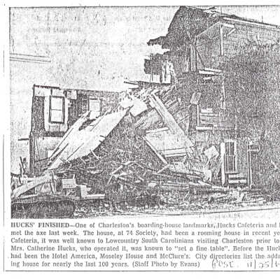 The house at 74 Society Street had been listed in city directories as a boardinghouse since ca. 1869. At the time of its demolition in 1969, it was Hucks Cafeteria and Boarding House. Prior to that, it had been the Hotel America, Moseley House, and McClure's. No additional house history on file. Needs further research.